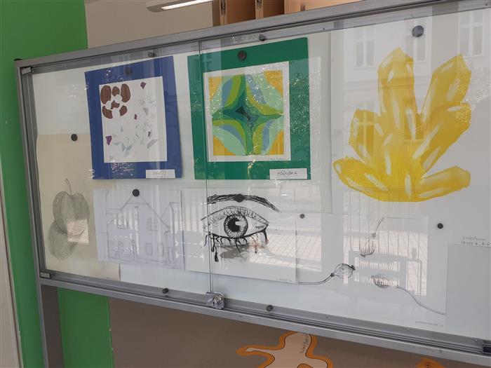 V divadelním sále se promítaly fotky ze školních akcí a k vidění byla také vernisáž výtvarného kroužku, kterou hudebně doprovodili žáci 9.ročníku.