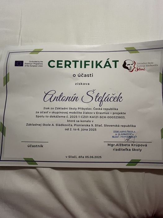 Právě končí týdenní pobyt naší 4.C ve slovenském Sliači- Erasmus 2025. Šest odvážlivců objevovalo krásy slovenského folkloru, sliačskou základní školu, zajímavá místa v okolí a zvyky spřátelených rodin. Všichni jsou plni zážitků a už se těší na nějaké PŘÍŠTĚ... .