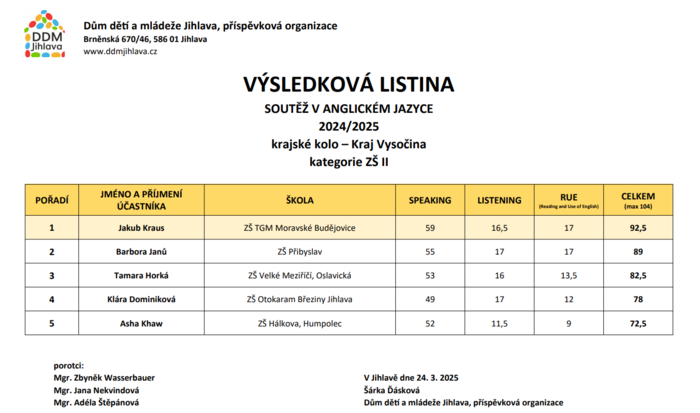 „Stříbrný odlesk“ má pokračování úspěšného „tažení“ žákyně IX.B Báry Janů! Po vítězství v okresním kole v Havlíčkově Brodě skvělým způsobem reprezentovala naši školu také v kole krajském, které se uskutečnilo v DDM Jihlava 24.3.2025. Kategorie ZŠ II / pro 8.a 9.ročníky/ měla 3 části: Speaking, Listening, Reading and Use of English. „Naše“ Bára dosáhla celkem 89 bodů a umístila se na krásném druhém místě! Pouhých 3,5 bodu ji dělilo od vítězství a postupu do ústředního kola! Nezbývá než k velkému úspěchu Báře gratulovat, poděkovat za vzornou reprezentaci naší školy a popřát mnoho štěstí úspěchů v dalším studiu!
