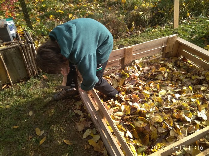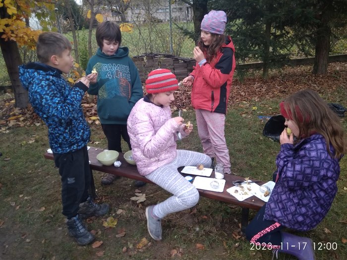 V pátek 17. listopadu uspořádali členové přírodovědného kroužku Otakárek brigádu na školní zahradě. Sešlo se celkem 8 dobrovolníků. V předchozím týdnu bylo počasí nevlídné, a tak bylo třeba připravit zahradu na zimu. Otakárci hrabali listí, dokončili nový vyvýšený záhon na borůvky a jahody, uklízeli sudy na dešťovou vodu, umývali zahradní náčiní, stříhali odplozené keře ostružiníku. Na konci tříhodinové brigády si upekli vypěstované brambory na ohni.